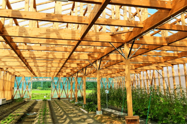 高さがあり熱がこもりにくく、ハウス自体が熱を持たないため、様々な作物の栽培に適した作りになっている。